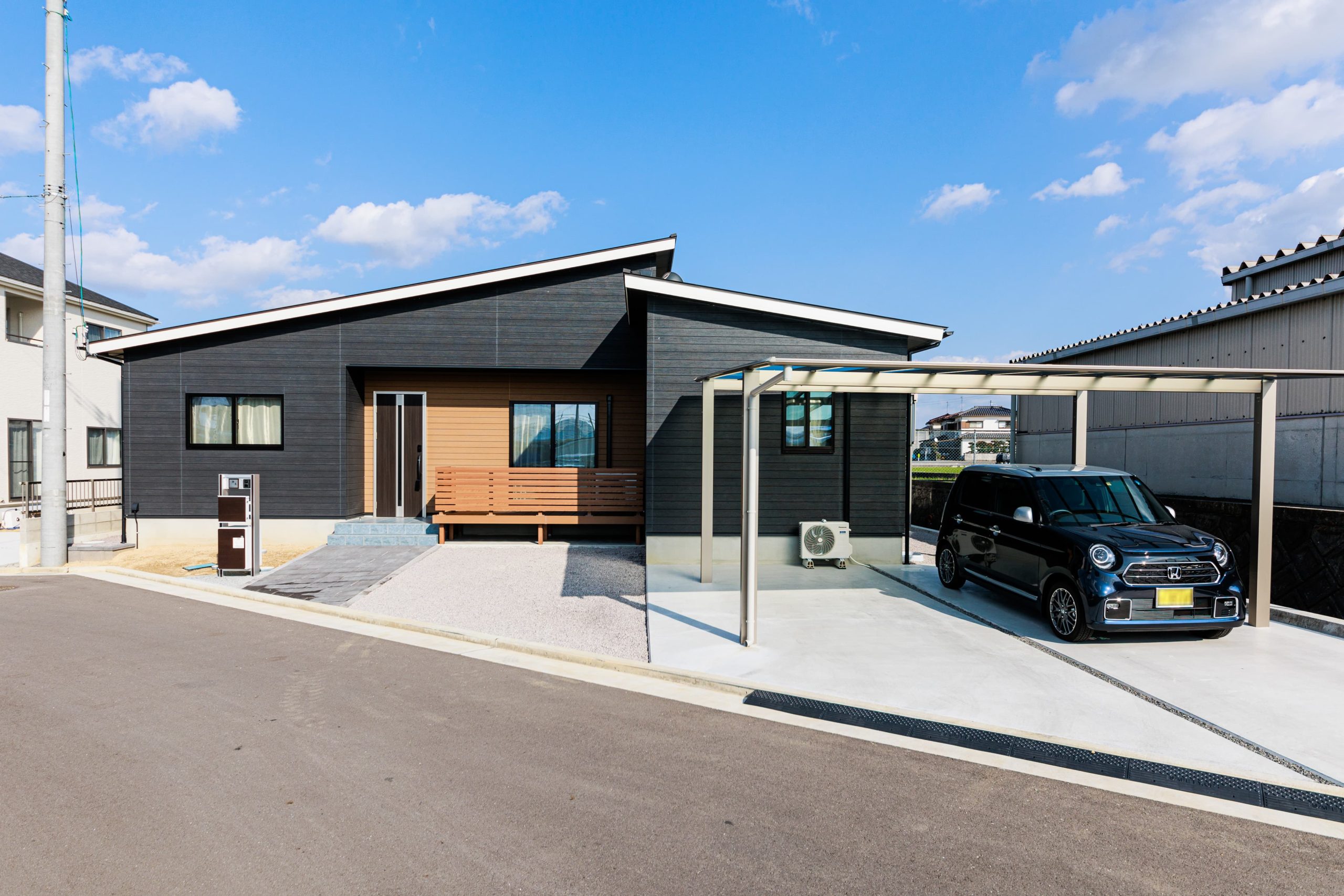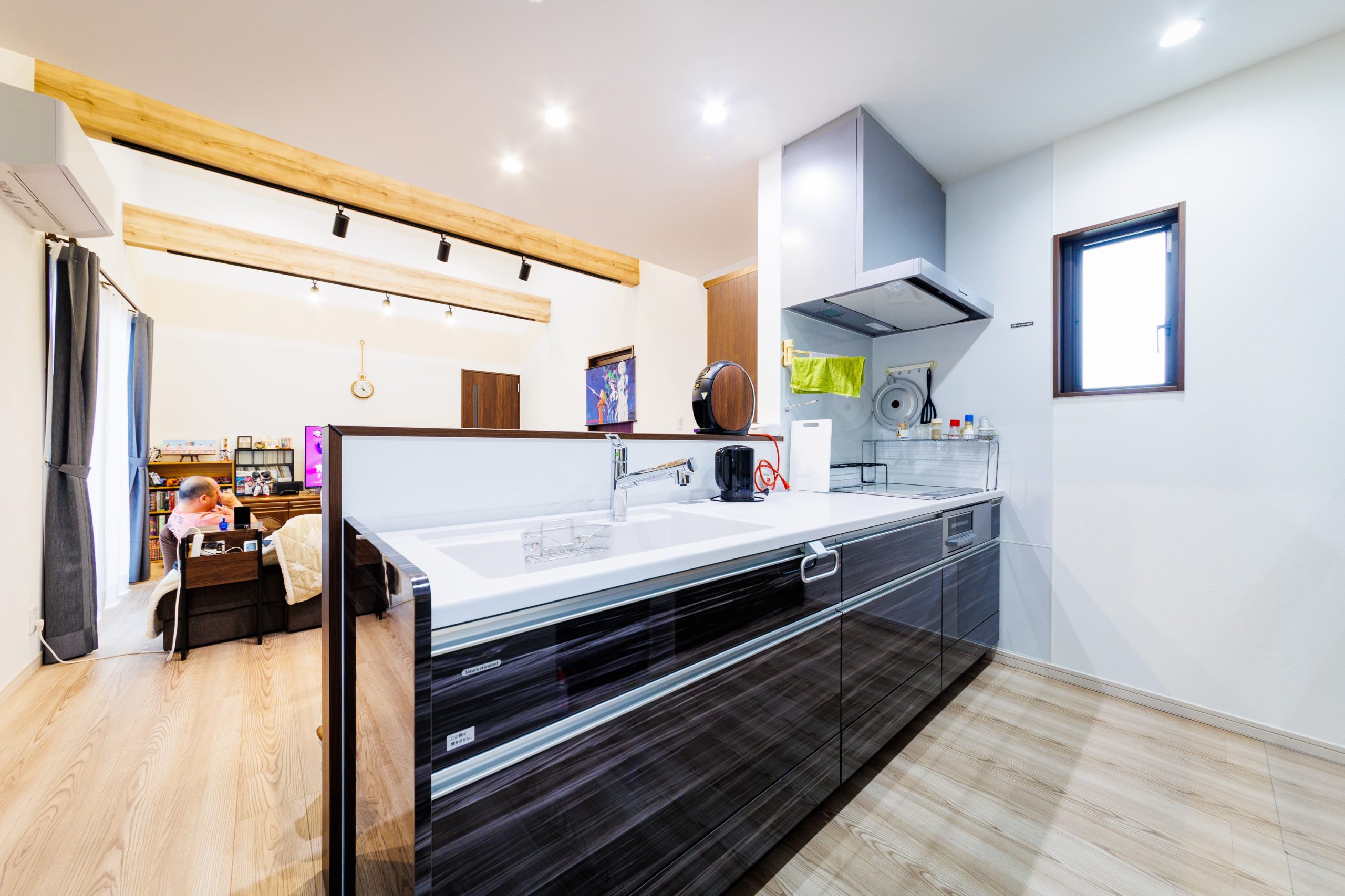 木目調が映えるアイランドキッチンのある洗練されたお家