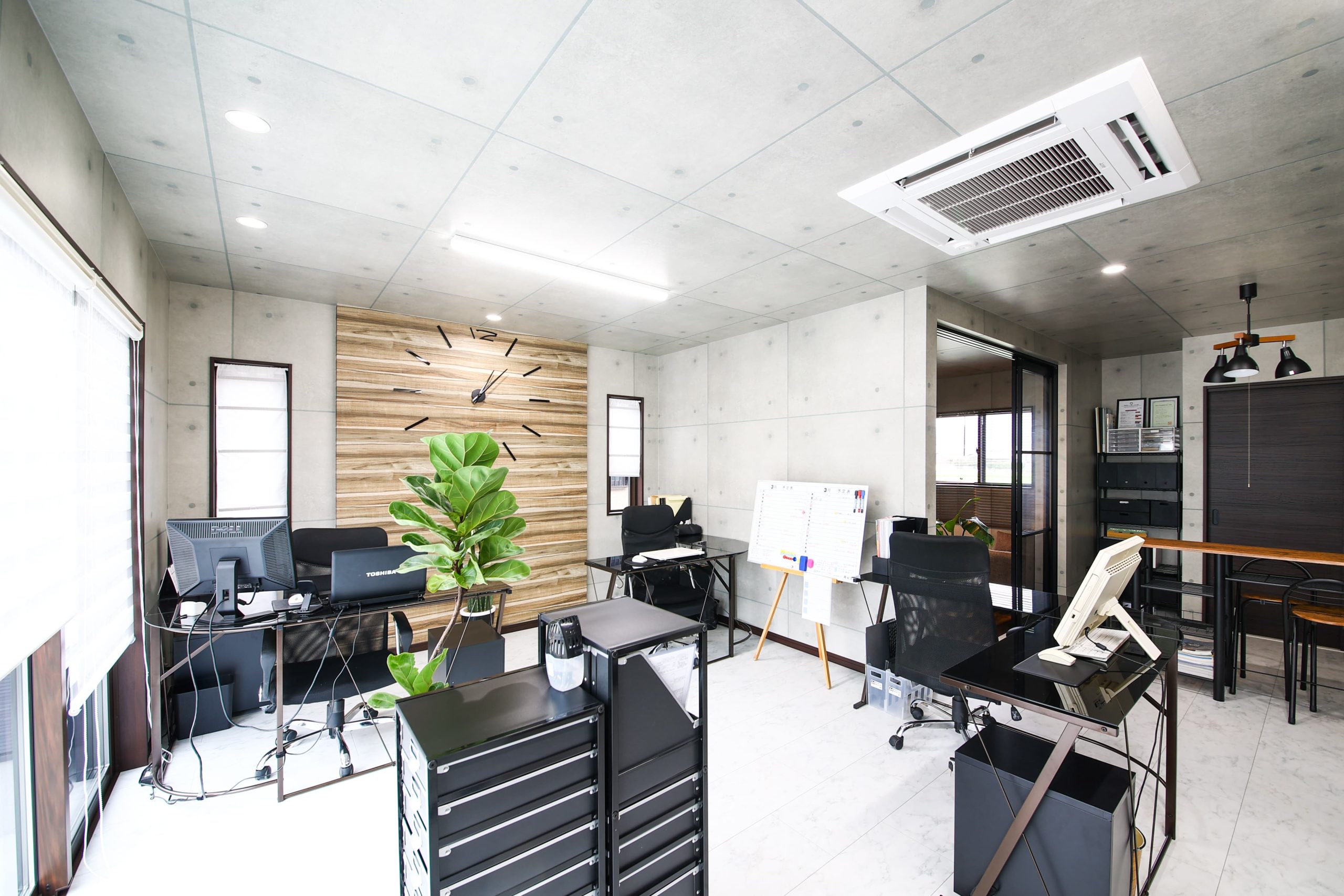 私達は住宅とは違い、事務所を建築していただきました。内観はコンクリート調、外観は黒い外壁に木目をアクセントにすることでカフェのような事務所に!事務所内の雰囲気と配置する家具が合うように設計したことで落ち着いて業務ができています。業者様や来場されるお客様にもオシャレな事務所とお褒めの声もいただき、大変満足しております!