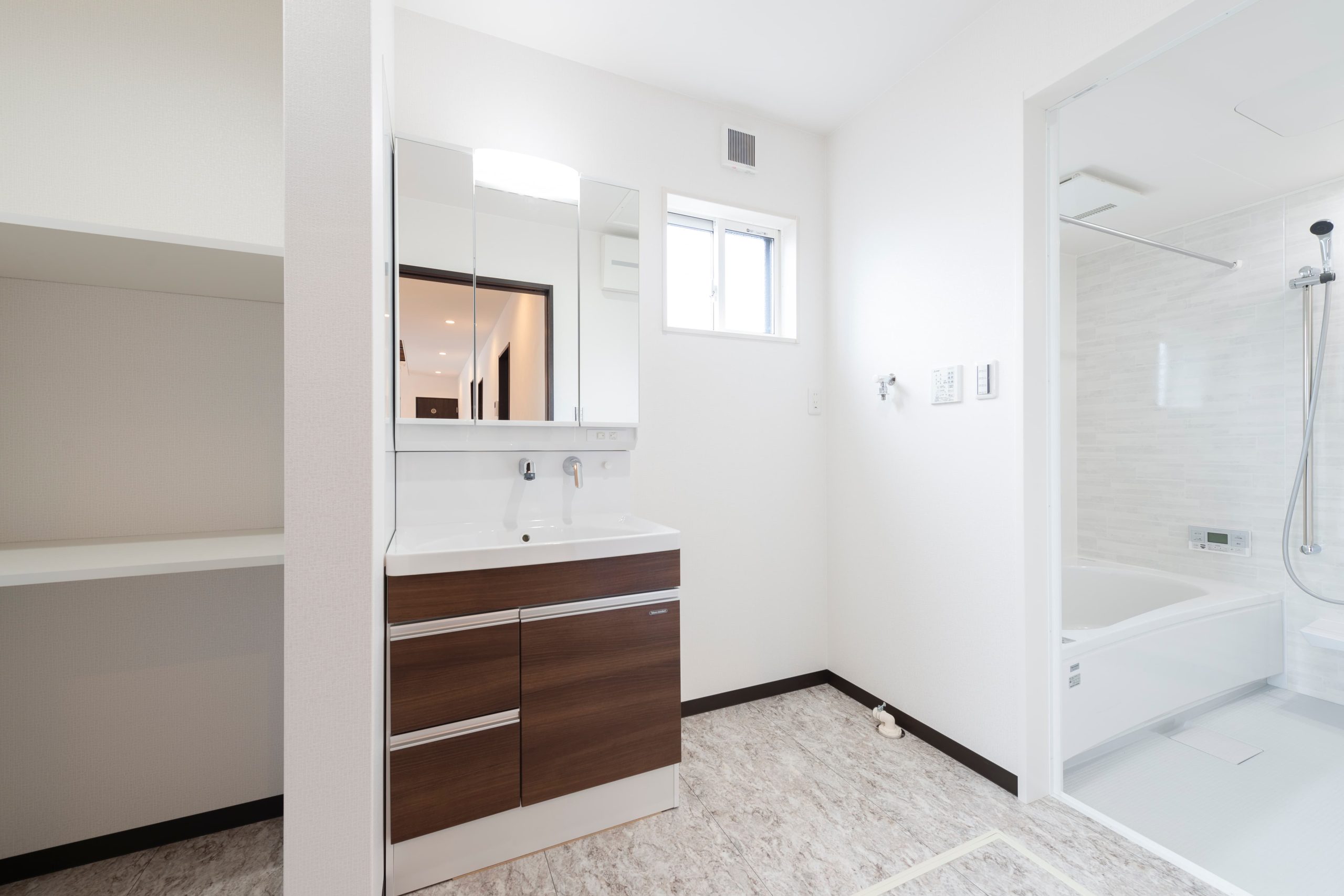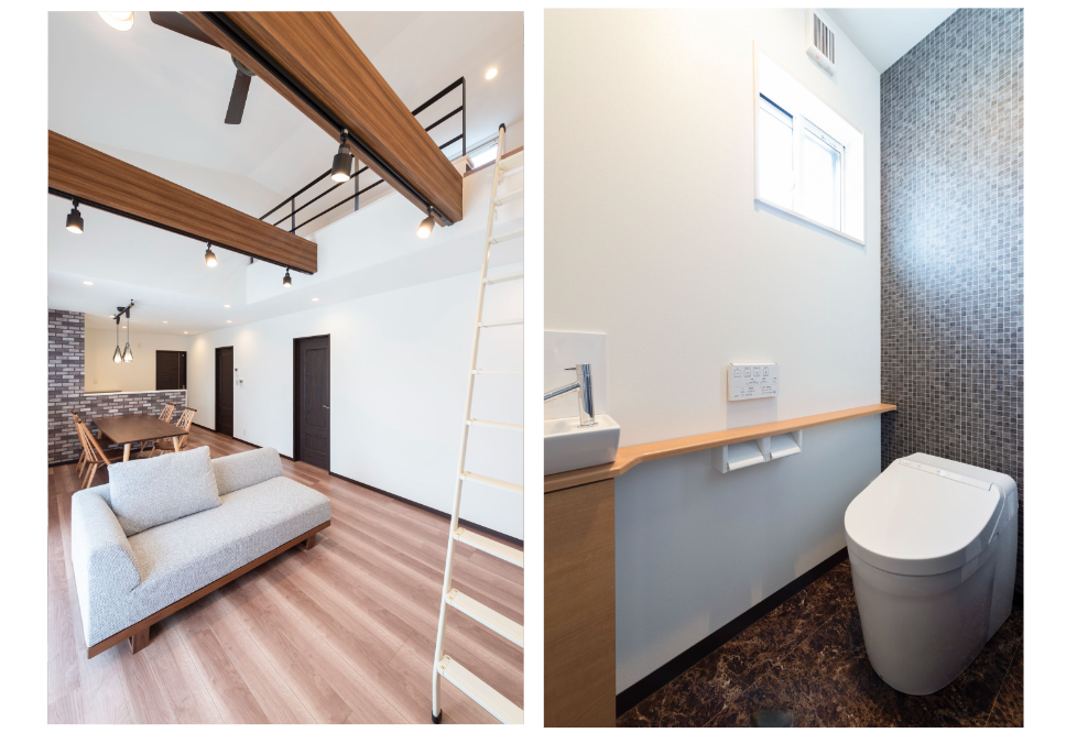 リビングは吹き抜け+ロフトで明るく開放的な空間を意識しました。また、3帖の広々洗面スペースは屋根付きウッドデッキへと続き、毎日の洗濯にとても便利です。パントリーとシューズクロークを設けることで収納スペース抜群の便利で住みやすい家になりました。
