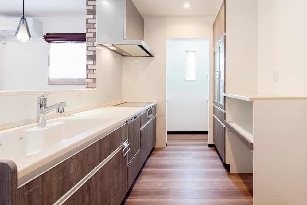 木目調が映えるアイランドキッチンのある洗練されたお家