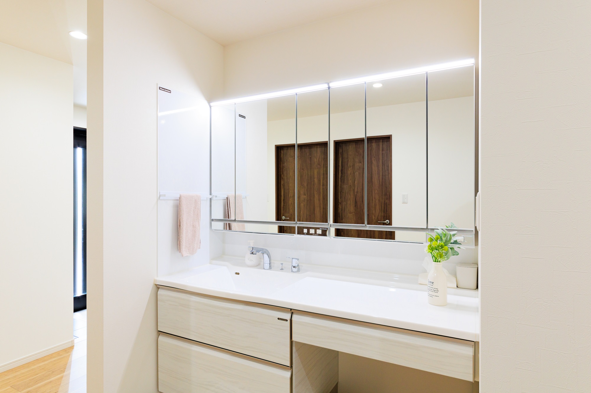家族全員分の衣類を収納できるファミリークローゼットやシューズクロークなど、収納スペースをしっかりと確保しました。また洗面台では座ってメイクやドライヤーができたり、2人同時に並んでも広々使えたりととても快適です。今後は白い壁を活かして自分好みのインテリアを楽しみたいです。