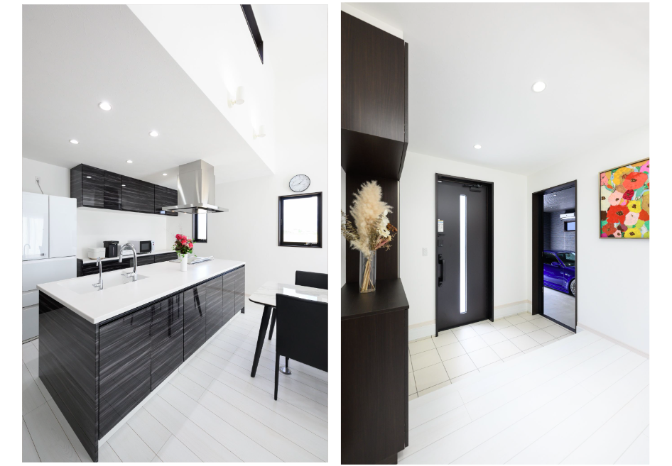 木目調が映えるアイランドキッチンのある洗練されたお家