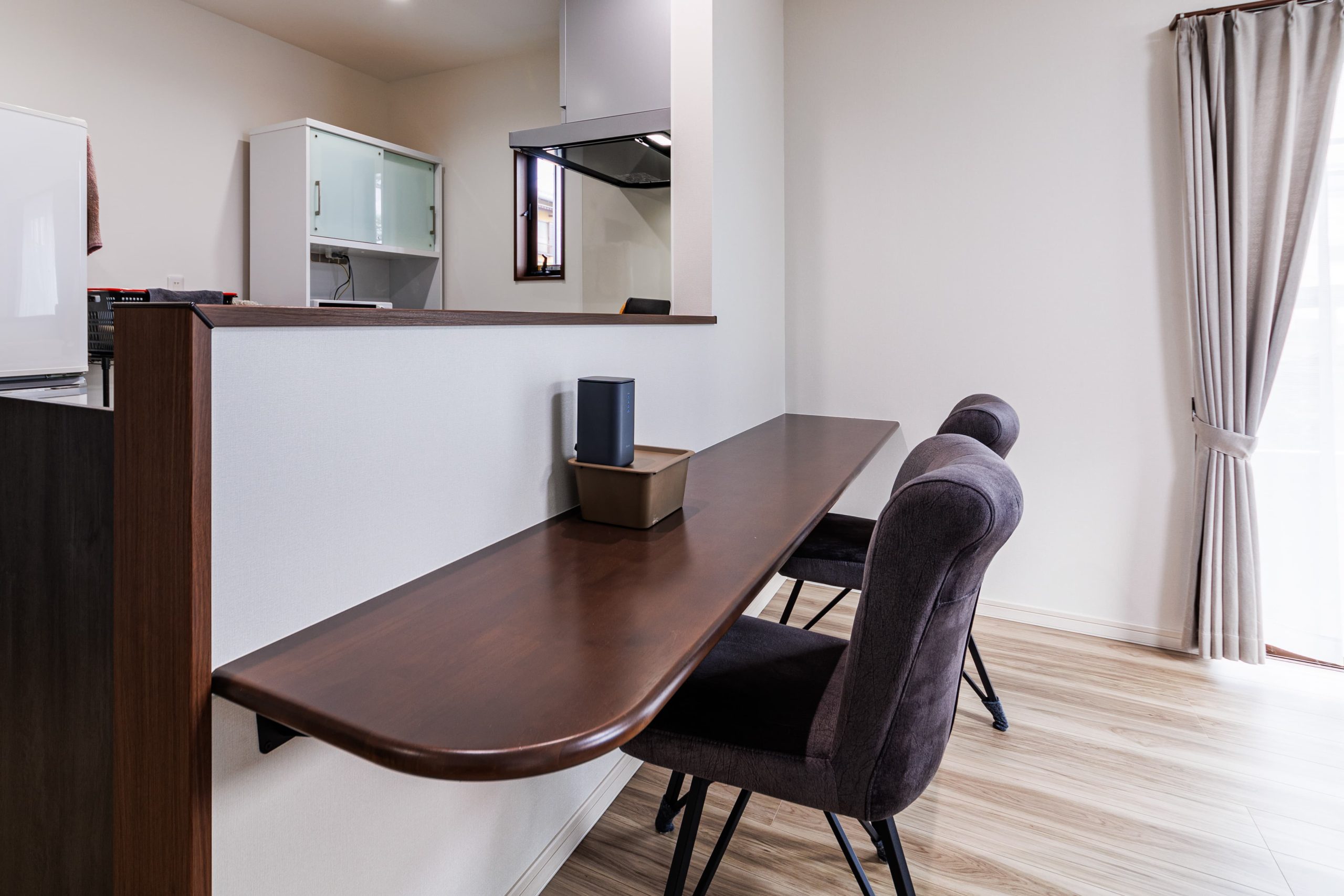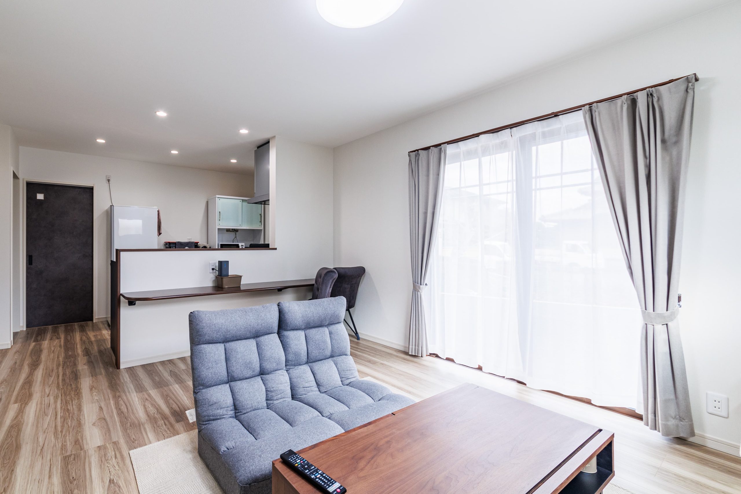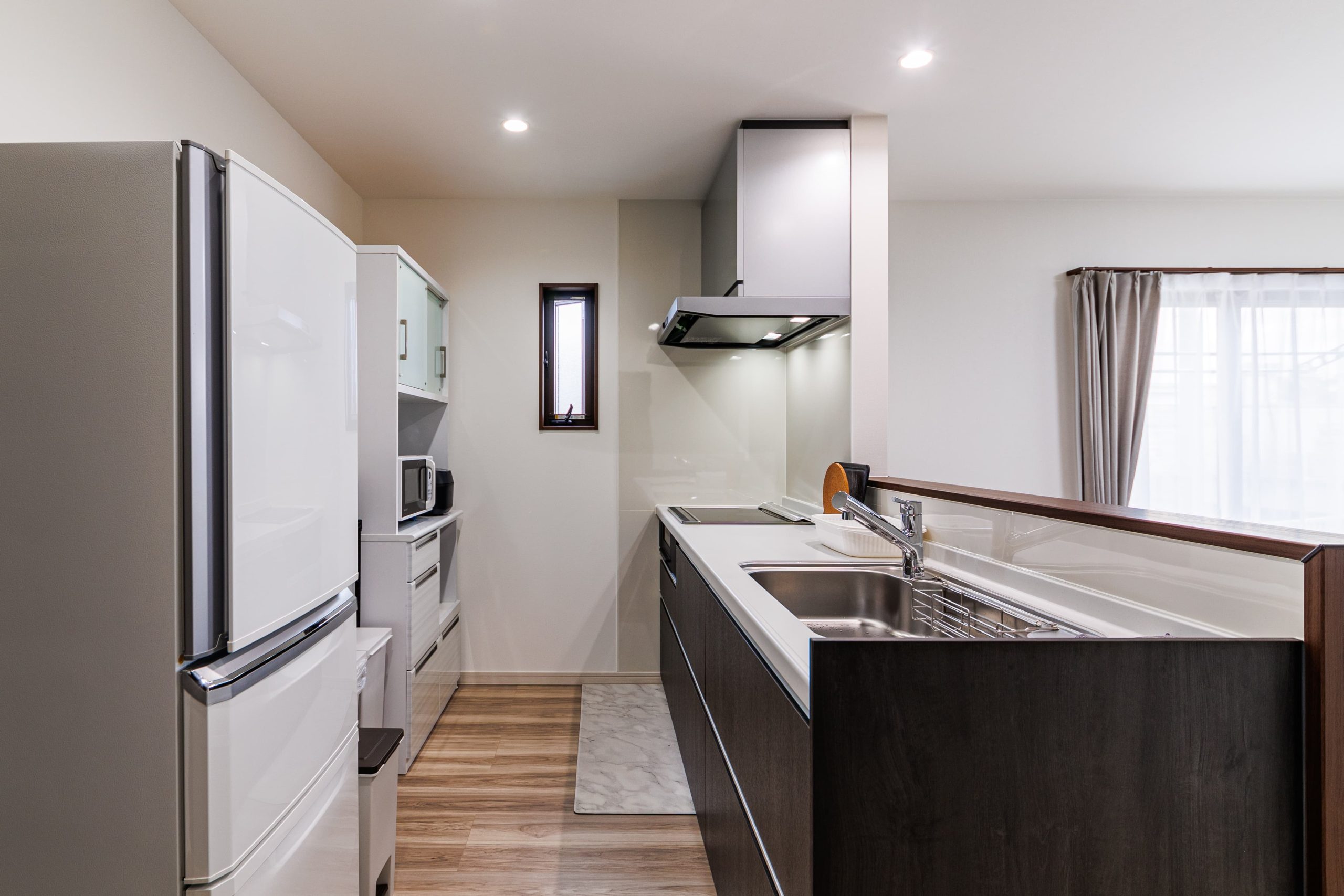 木目調が映えるアイランドキッチンのある洗練されたお家