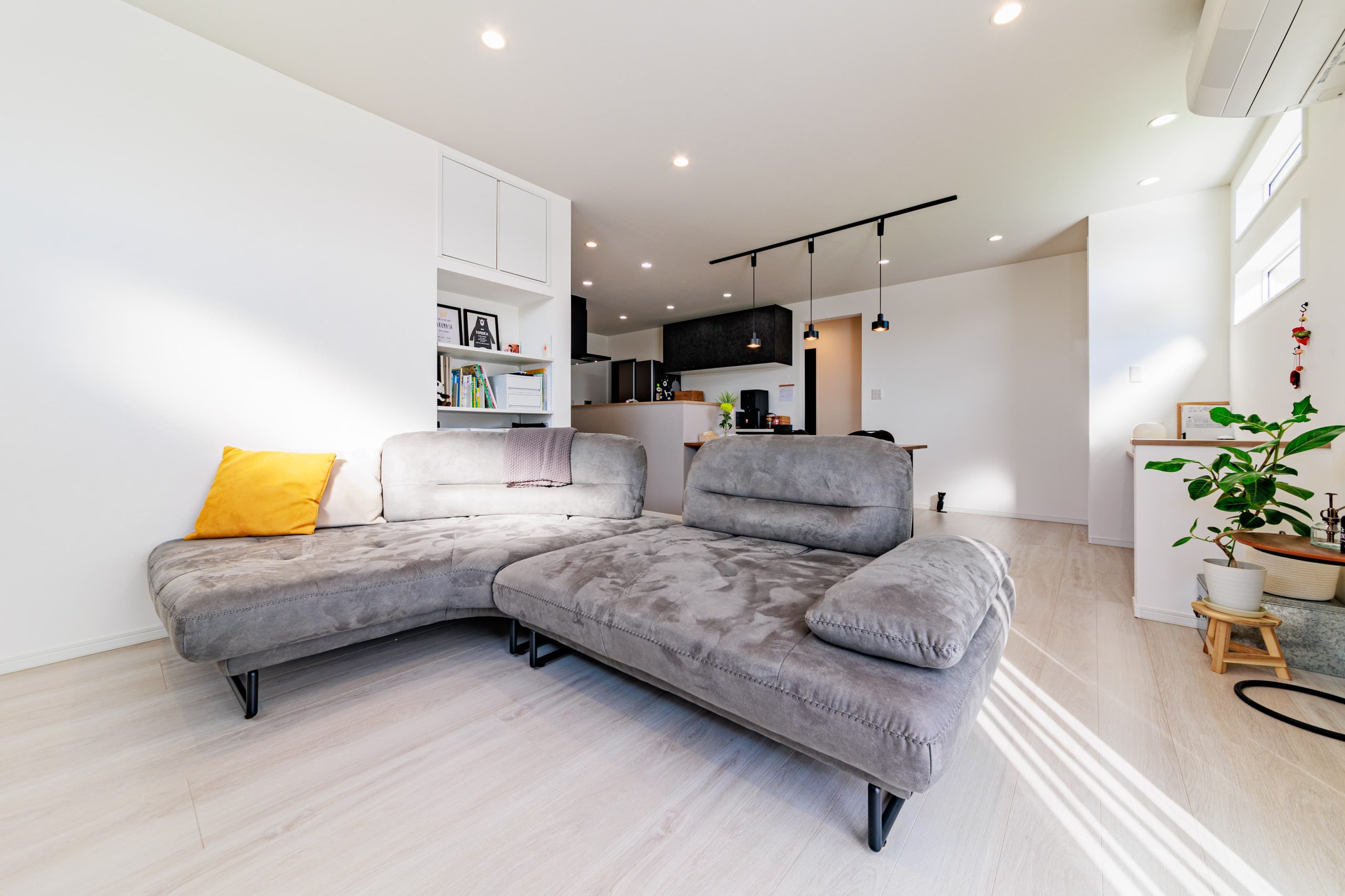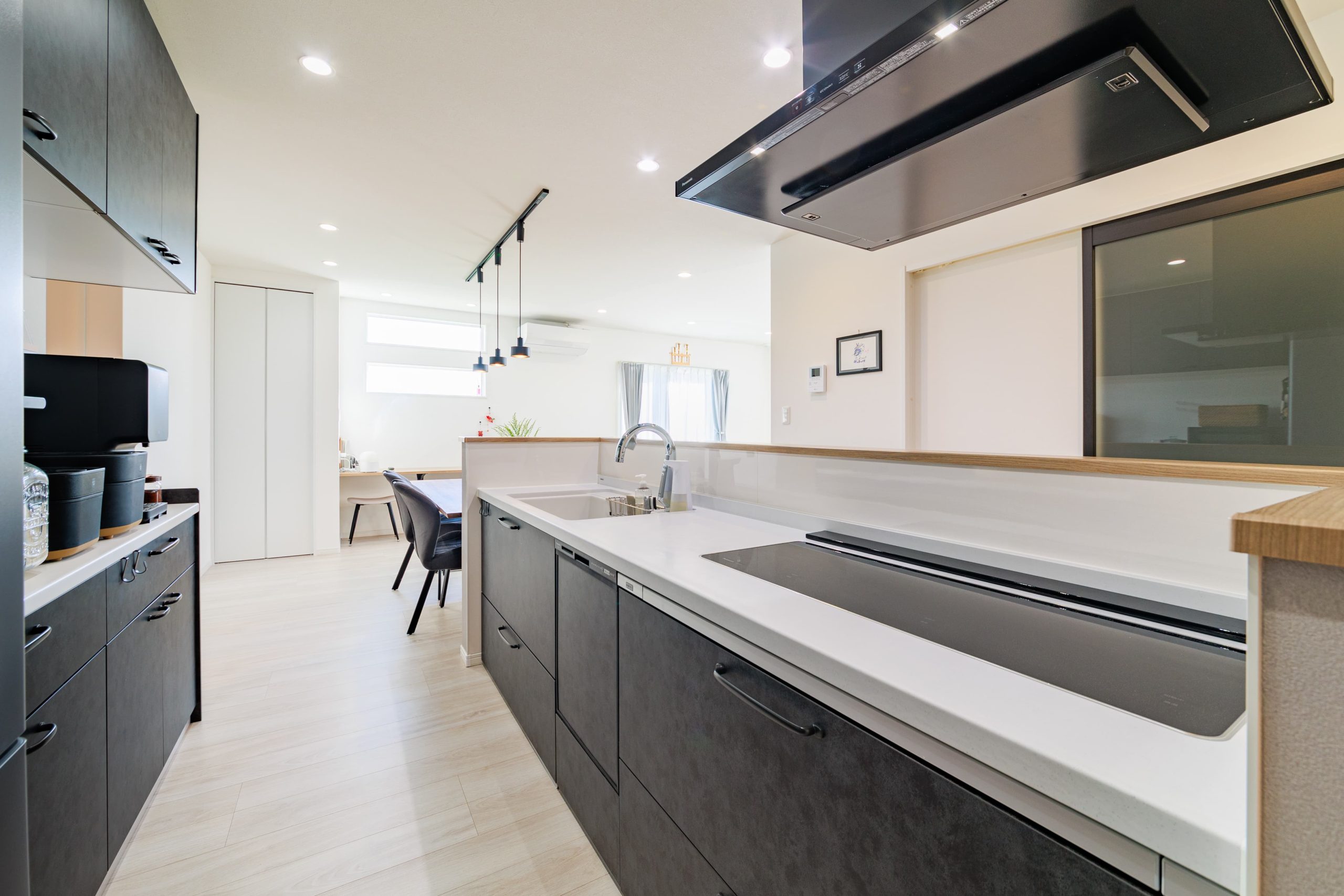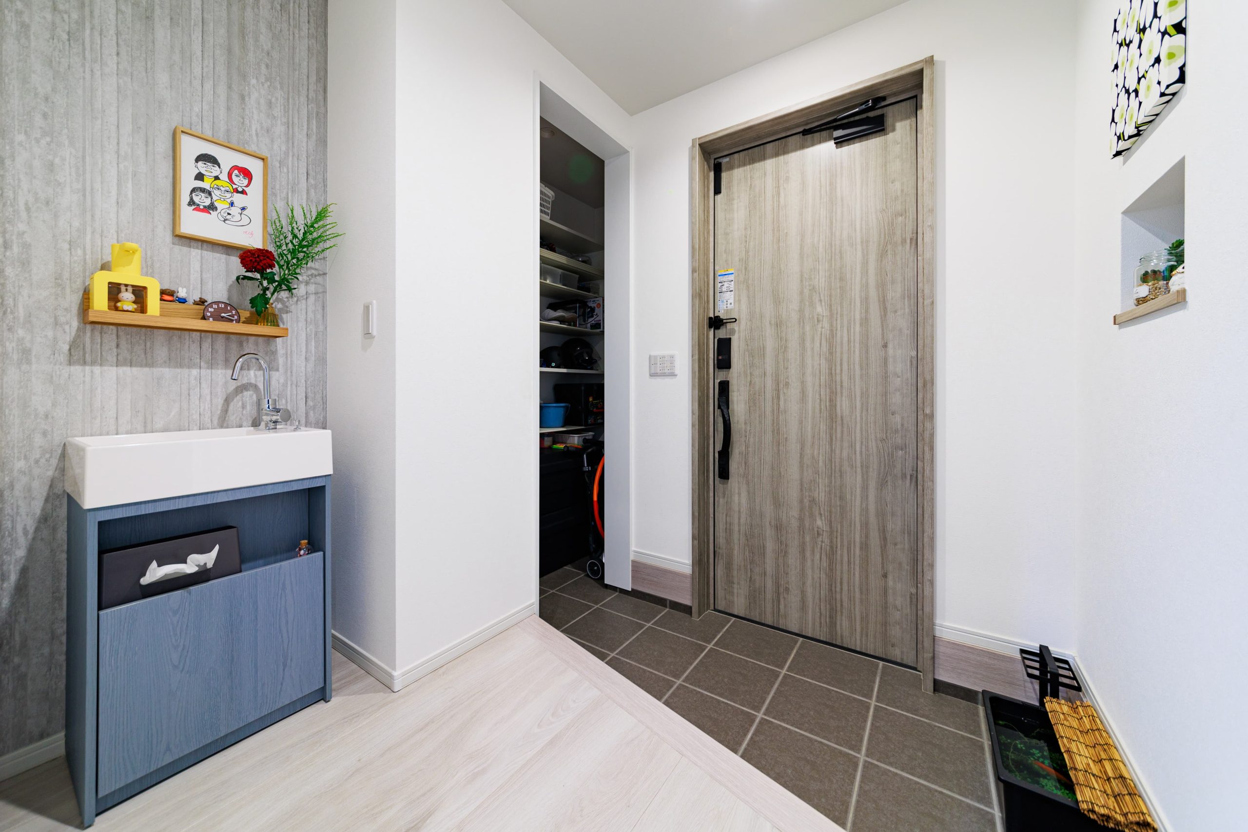 ご提案いただいた家事ラク動線を考慮したランドリールームからウォークインクローゼット、キッチンからパントリーの動線がお気に入りです。他にも家族4人それぞれの部屋とみんなが集まって過ごせるリビングも気に入っています。内観はシンプルな雰囲気にしたかったので、グレー・白・黒・木目調で統一するため床や壁、ドアにこだわりました。
