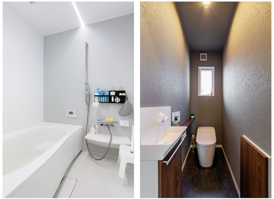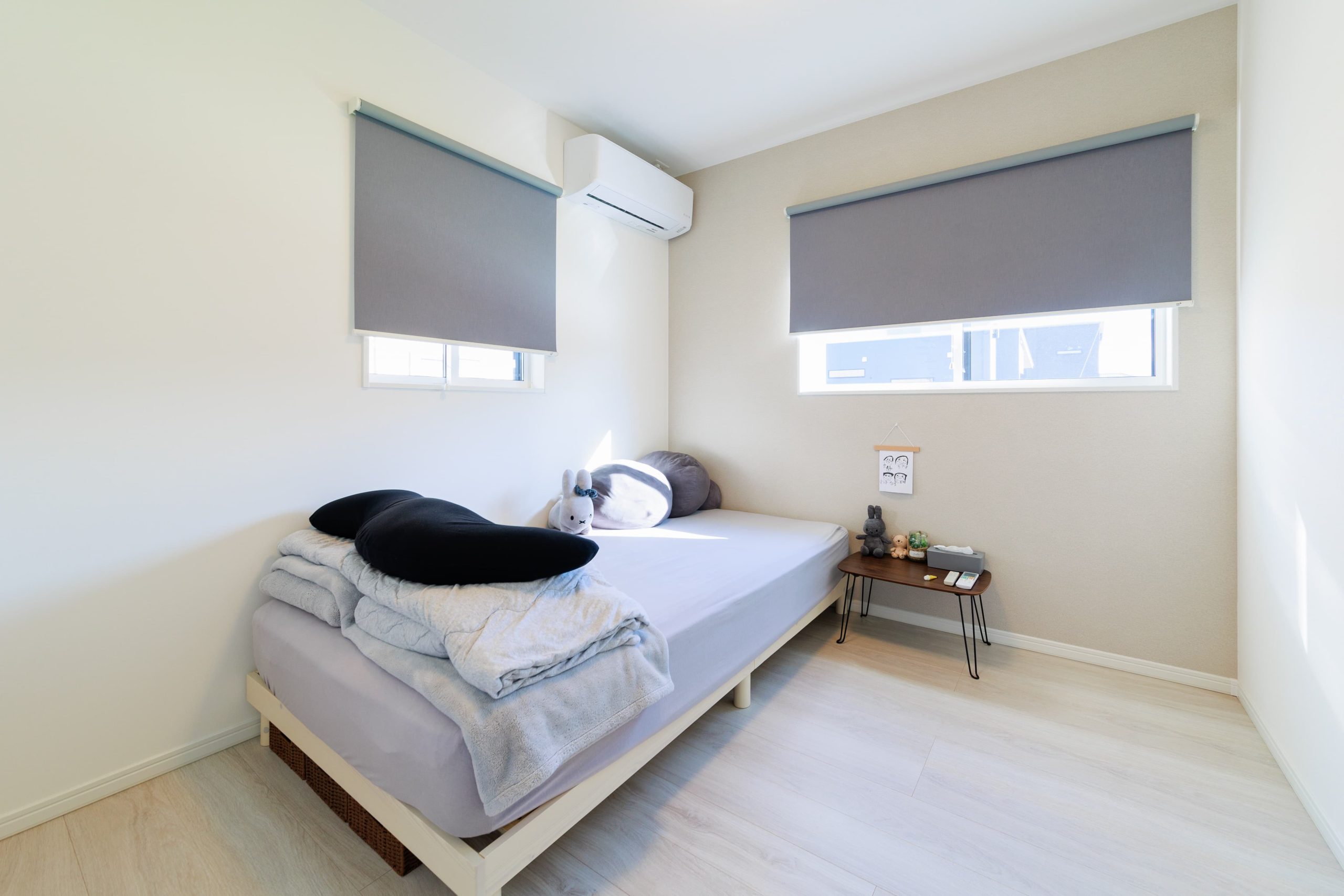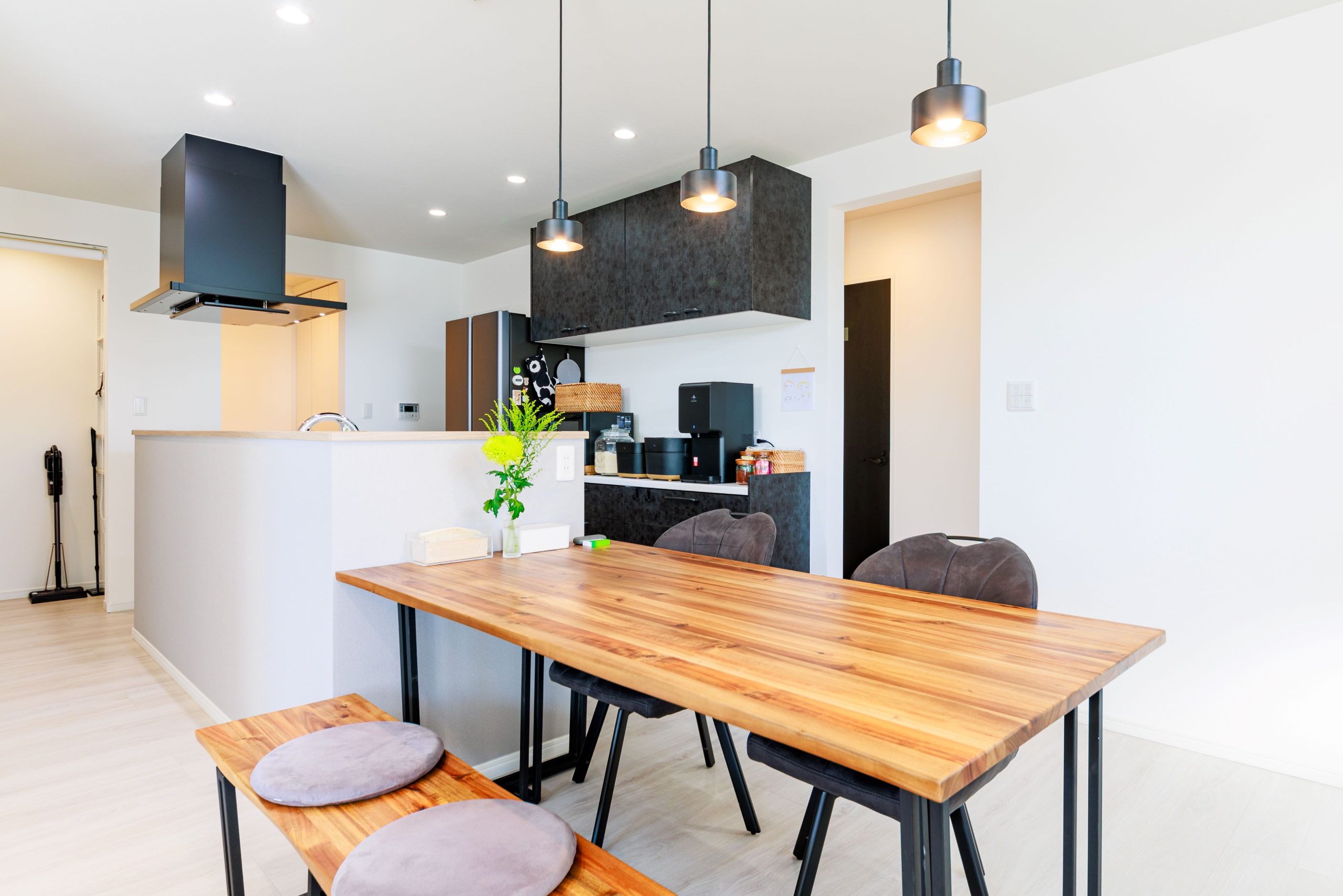 ご提案いただいた家事ラク動線を考慮したランドリールームからウォークインクローゼット、キッチンからパントリーの動線がお気に入りです。他にも家族4人それぞれの部屋とみんなが集まって過ごせるリビングも気に入っています。内観はシンプルな雰囲気にしたかったので、グレー・白・黒・木目調で統一するため床や壁、ドアにこだわりました。