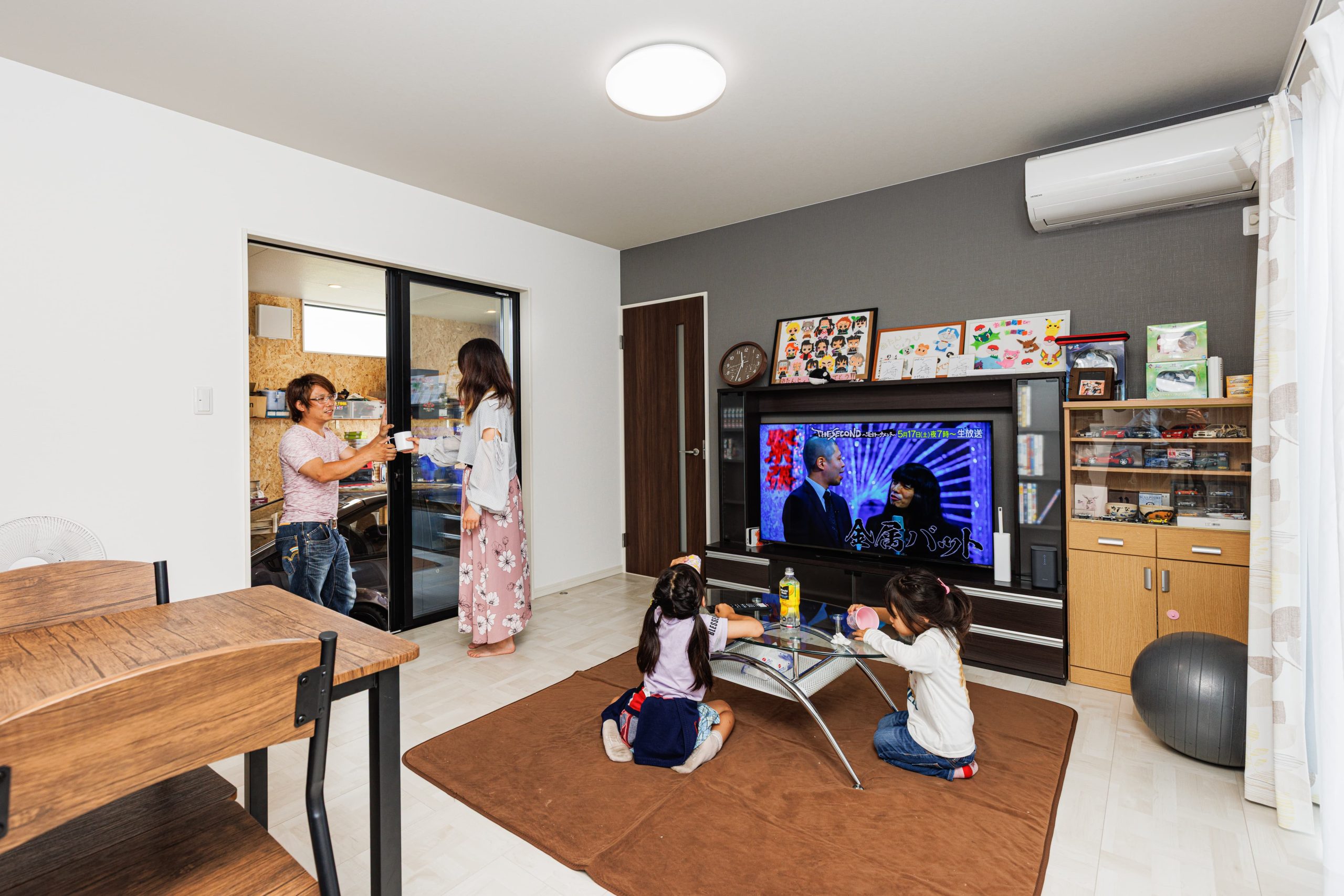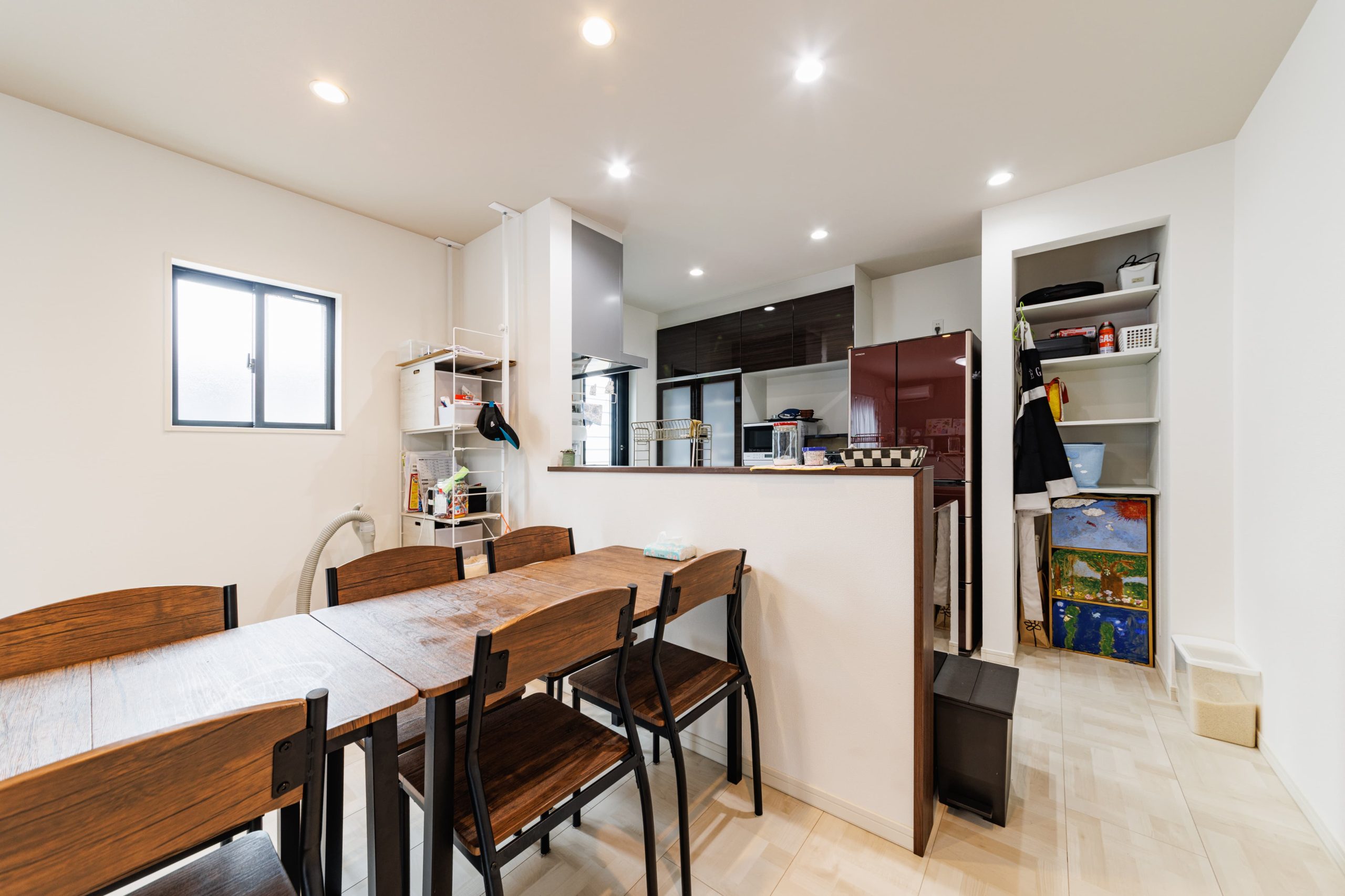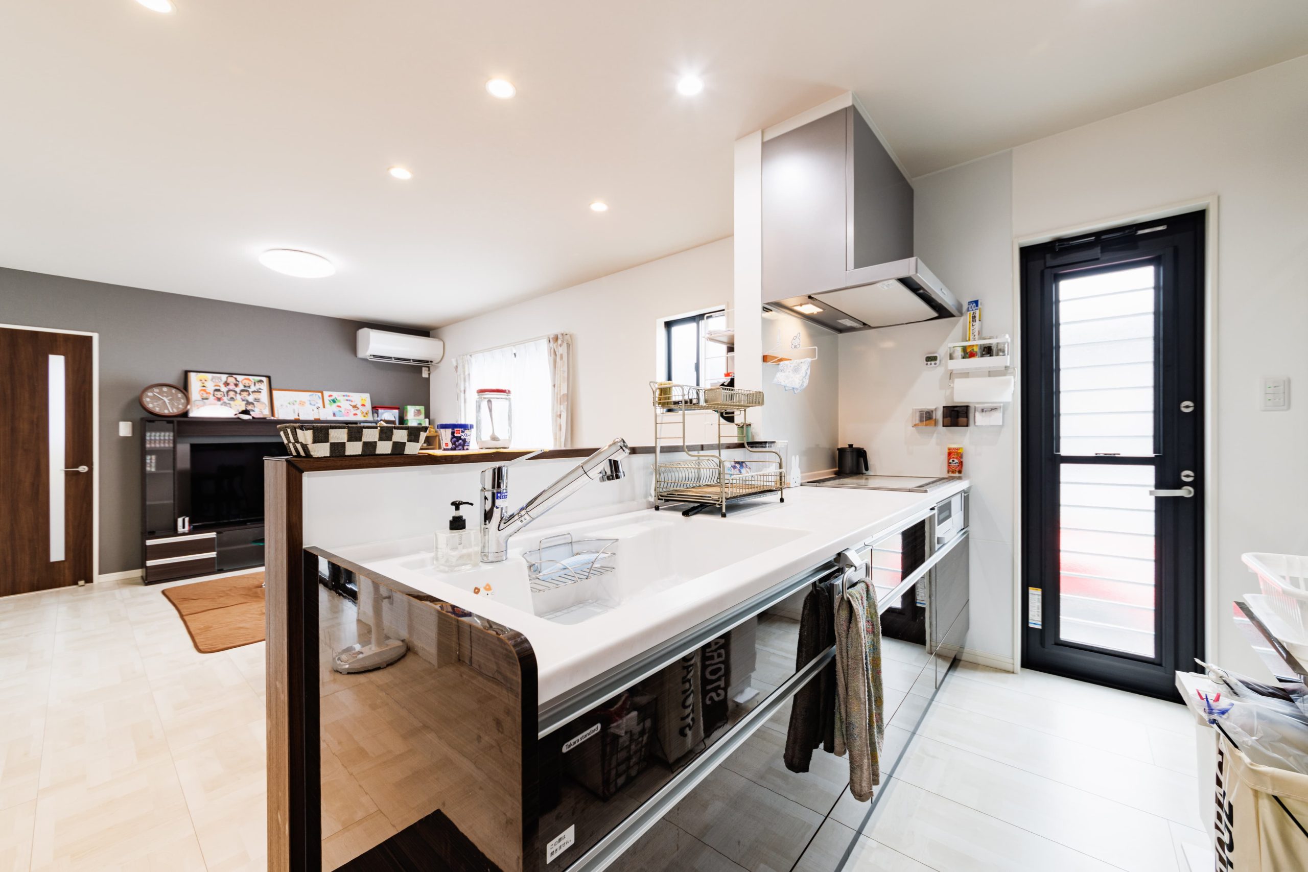 木目調が映えるアイランドキッチンのある洗練されたお家