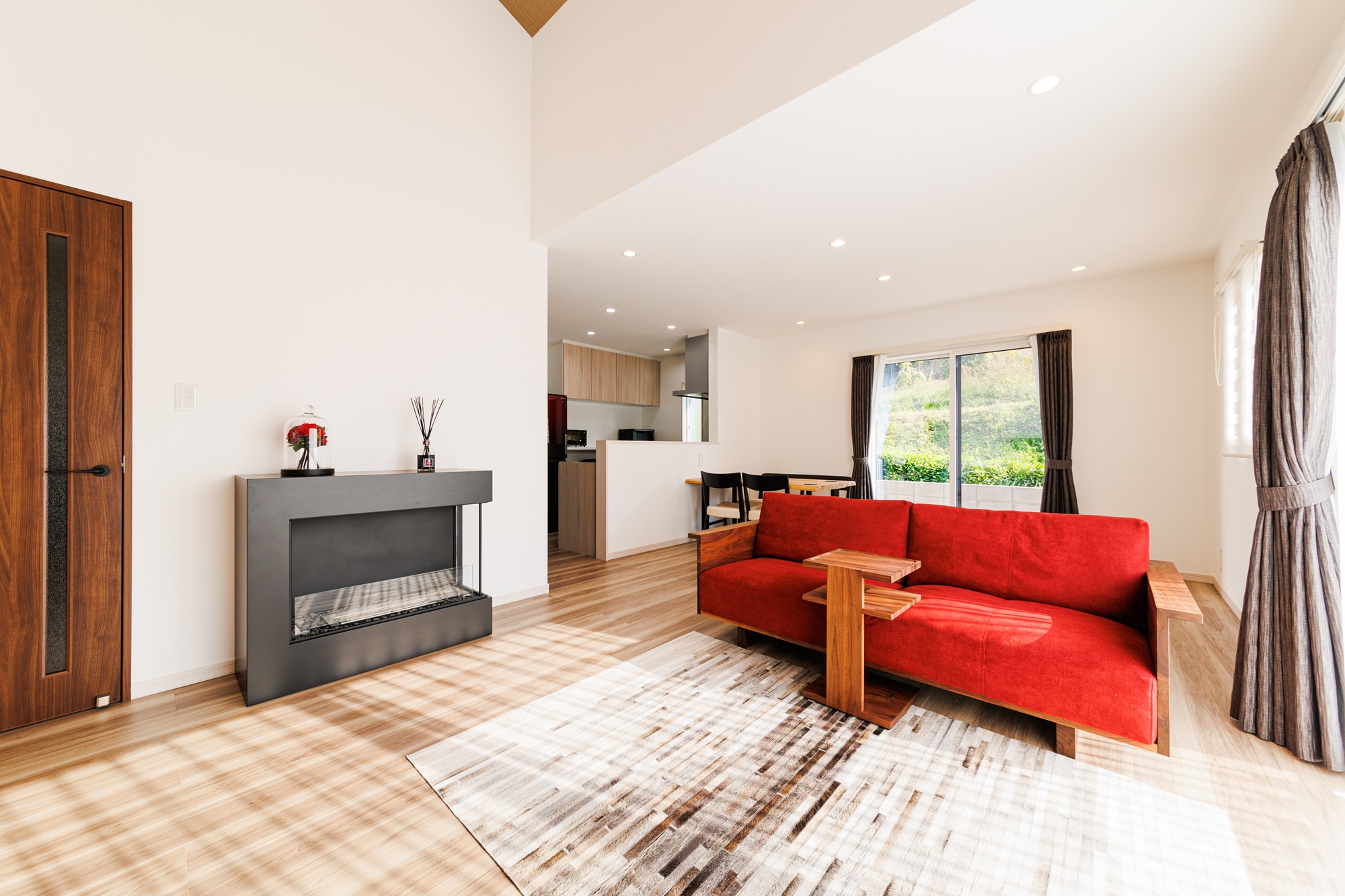 吹き抜けリビングとウッドデッキがあるお家